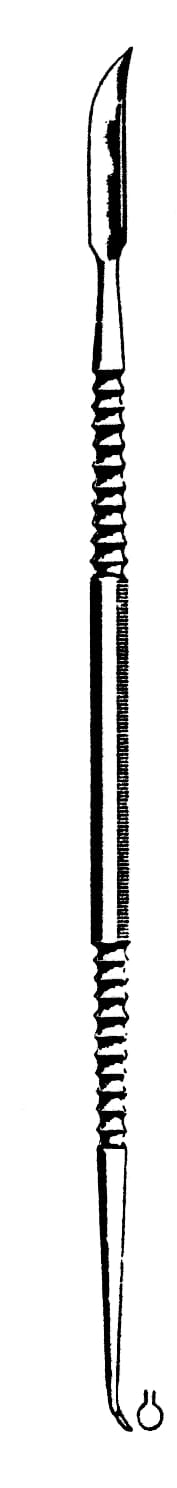 Łopatka, nożyk, używany do tworzenia półek na opaskach językowych, rzeźbienia mostów między zębami i pełnych odlewów koron.